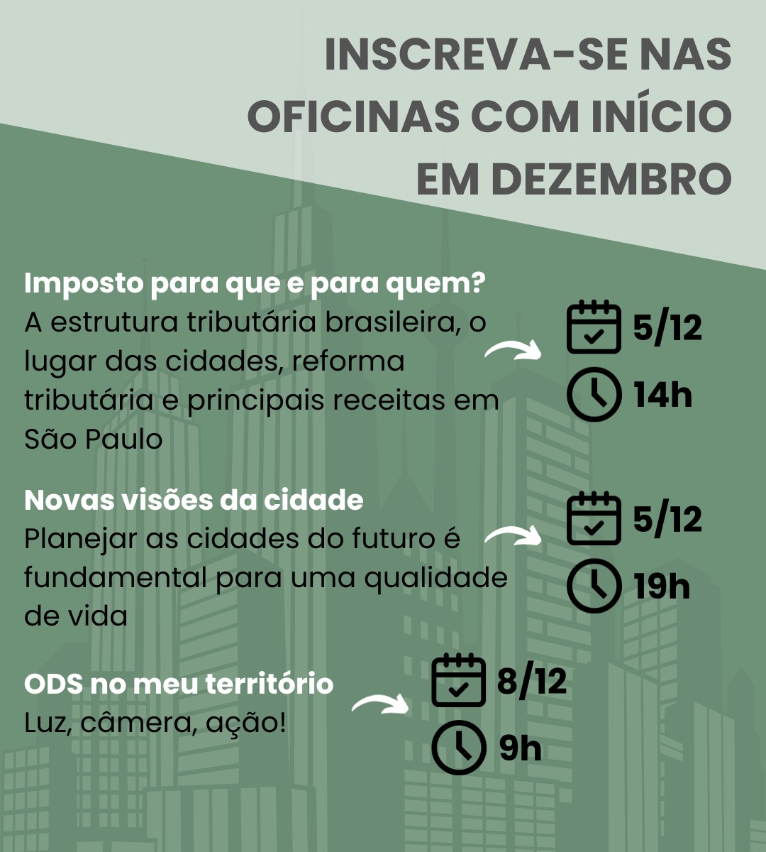 Em dezembro, a parceria estabelecida entre a Escola Superior de Gestão e Contas Públicas (EGC) do Tribunal de Contas do Município de São Paulo (TCMSP) e a Coordenadoria de Governo Aberto, da Casa Civil da Prefeitura de São Paulo, oferece aos interessados três novas oficinas, na modalidade on-line, sobre aspectos diversos da gestão pública da cidade de São Paulo.