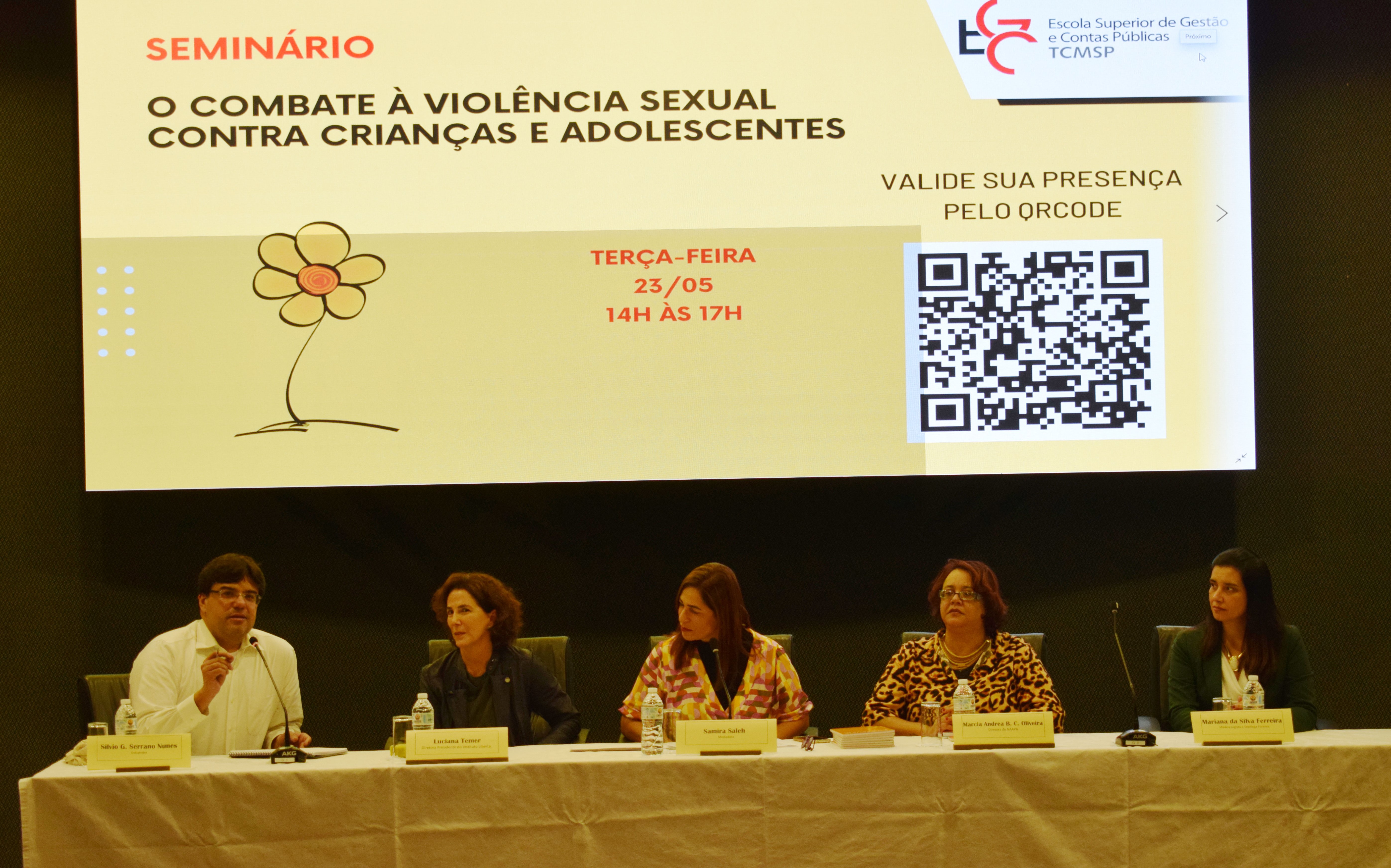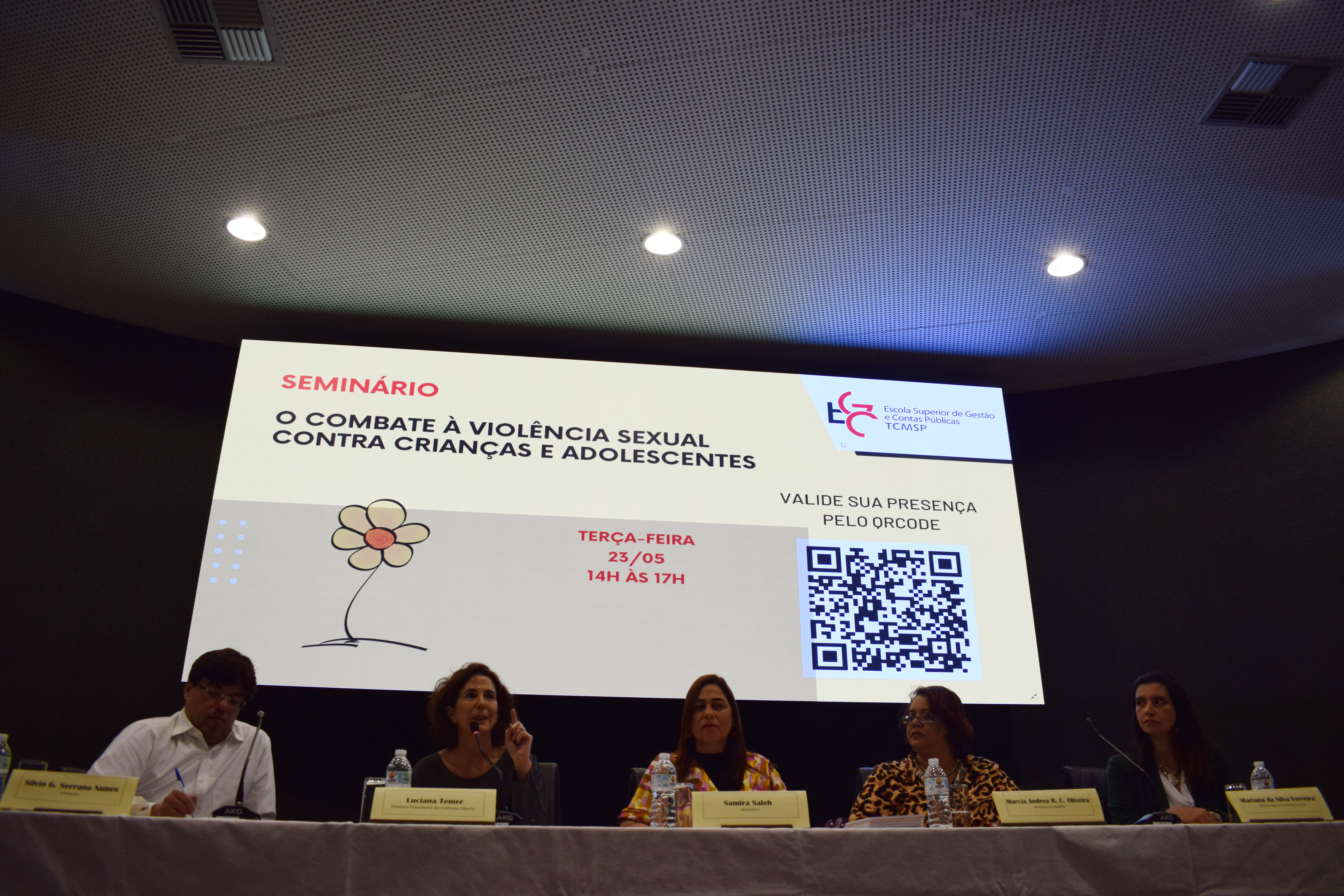 Na tarde desta terça-feira, 23 de maio, ocorreu, no auditório da Escola de Gestão e Contas Públicas (EGC) do Tribunal de Contas do Município de São Paulo (TCMSP), o seminário “O combate à violência sexual contra crianças e adolescentes”. Com participação da diretora-presidente do Instituto Liberta e ex-secretária de Assistência e Desenvolvimento Social do município de São Paulo, Luciana Temer, da diretora do Núcleo de Apoio e Acompanhamento para Aprendizagem (NAAPA) da Secretaria Municipal de Educação (SME), Márcia Andrea Bonifácio da Costa Oliveira, e da médica legista e sexóloga forense Mariana da Silva, o evento foi mediado pela pedagoga e mestranda da PUC-SP e servidora da EGC/TCMSP, Samira Saleh e contou ainda com a participação do professor da EGC, Silvio Gabriel Serrano Nunes, na qualidade de debatedor. O conselheiro dirigente da EGC, João Antonio da Silva Filho, o conselheiro presidente do TCMSP, Eduardo Tuma, o diretor presidente da EGC, Ricardo Panato, e o chefe de Gabinete da Escola, Marcos Barreto, também prestigiaram o encontro, que reforçou a necessidade de romper com a invisibilidade da violência sexual cometida contra as crianças e adolescentes, um crime grave e bastante frequente, mas cuja verdadeira dimensão ainda é pouco conhecida por conta da subnotificação das ocorrências e pela omissão de quem as presencia.
